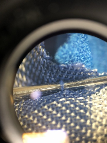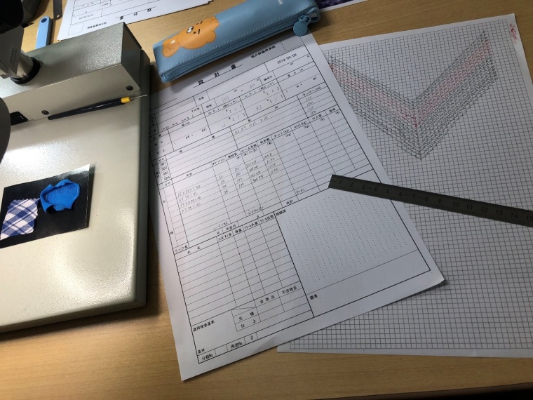 顕微鏡を使って生地の分解(生地の編み方の分析)をし、それを元に設計書作成を行いました。