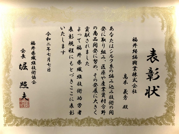 フクイタテアミ代表取締役社長の髙木が、第57回福井県繊維技術功労者の一人に選ばれ、表彰されました!