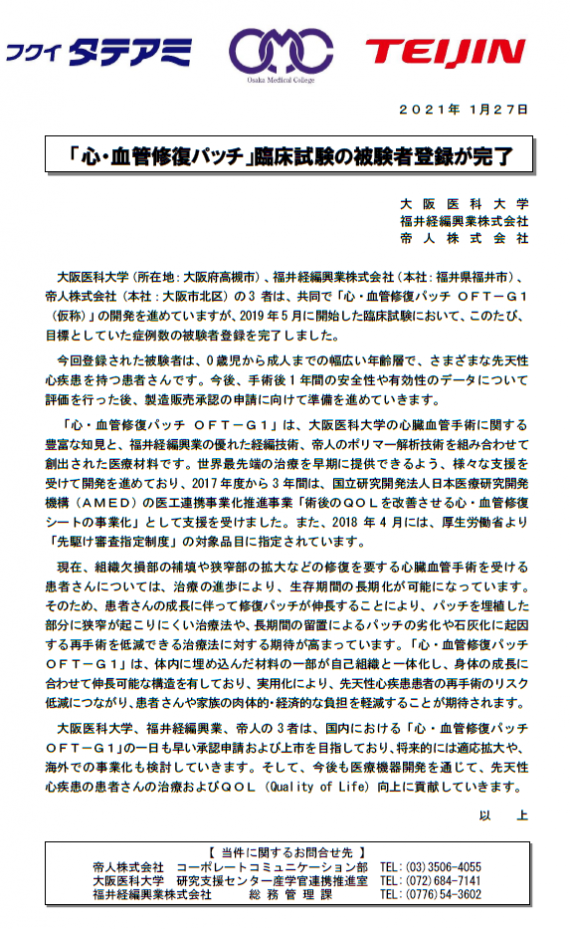 「心・血管修復パッチOFT-G1」の開発を進めていますが、2019年5月に開始した臨床試験において、このたび、目標としていた症例数の被験者登録を完了いたしました。 今回と登録された被験者は、0歳児から成人までの幅広い年齢層で、さまざまな先天性心疾患を持つ患者さんです。ご協力を賜りました患者さん、そのご家族、関係者の皆さまに心より感謝申し上げます。 「心・血管修復パッチOFT-G1」を必要としてくださる方に一日も早くお届けできるよう、一同、今後とも精一杯務めてまいります。