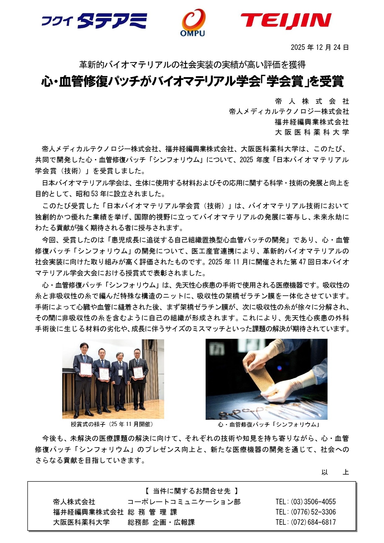 バイオマテリアル学会「学会賞」を受賞しました