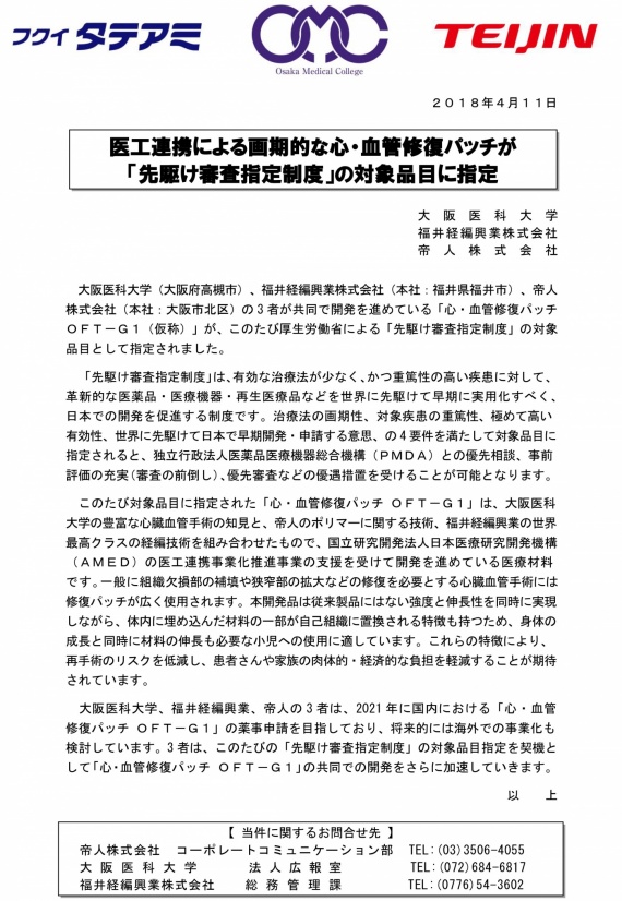 開発を進めております「心・血管修復パッチ」がこの度、厚生労働省による 「先駆け審査指定制度」の対象品目として指定されました。 本日、プレスリリースとなりました。 まさに、国家プロジェクトとして、開発をさらに加速して行きます。